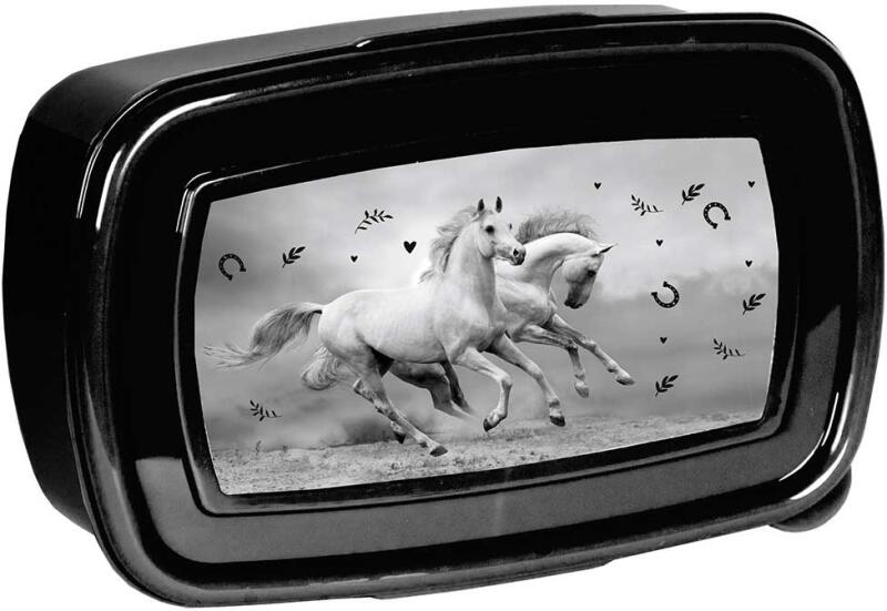 A jó minőségű, BPA mentes műanyagból készült Lovas műanyag uzsonnás doboz - fekete-fehér (PP24KE-3022)  fekete-fehér színével és cuki mintájával az iskolás és óvodás lányoknak is tökéletes választás. A doboz kialakításánál nagy gondot fordítottak a szivárgásmentességre, valamint mosogatógépben is mosható.  A Lovas műanyag uzsonnás doboz  elengedhetetlen kiegészítője a hátizsáknak kirándulások alkalmával vagy az óvodában, iskolában a tízórai tárolásához.